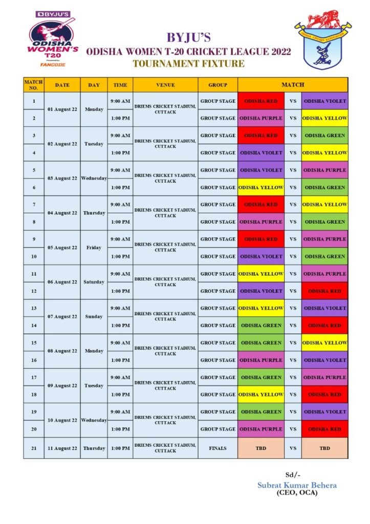 Like the previous year, a total five teams (Odisha Violet, Odisha Red, Odisha Green, Odisha Yellow, Odisha Purple) will participate in the upcoming BYJU’S Odisha Women’s T20 Cricket League 2022. The final will be played on Aug 11.