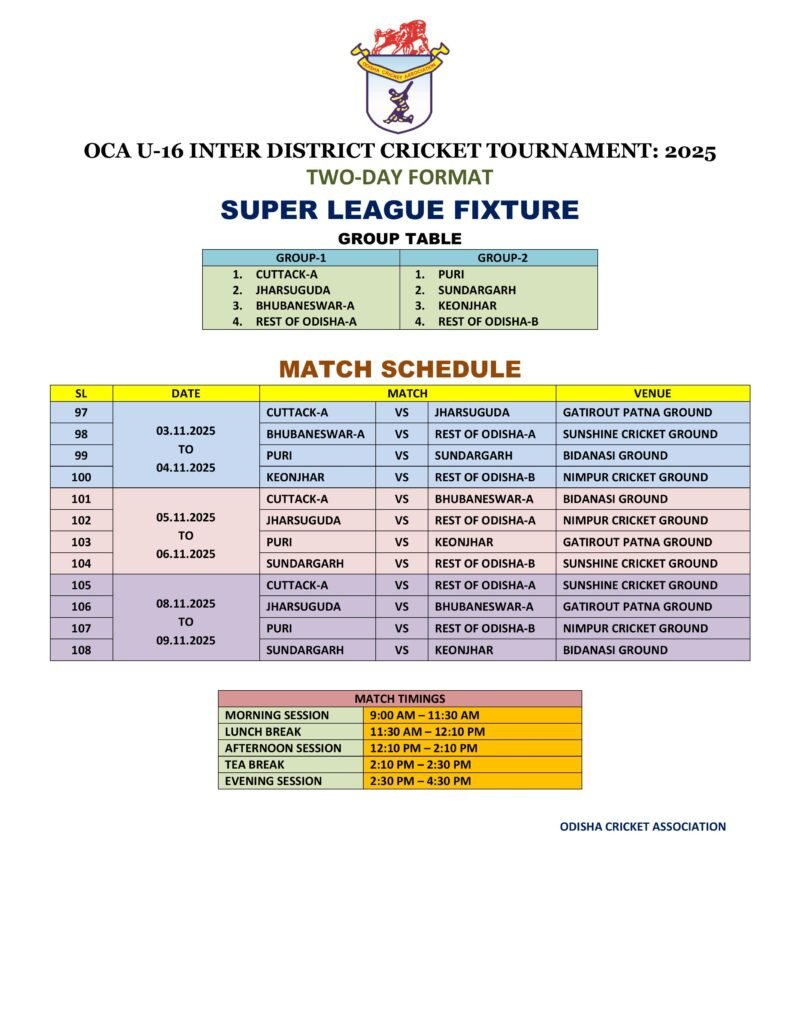 Cuttack: The Odisha Cricket Association (OCA) has announced the Super League fixtures for the 2025 edition of the U-16 Inter-District Cricket Tournament, set to begin on November 3. The two-day format matches will feature eight teams divided into two groups, with games scheduled across four venues in Cuttack.