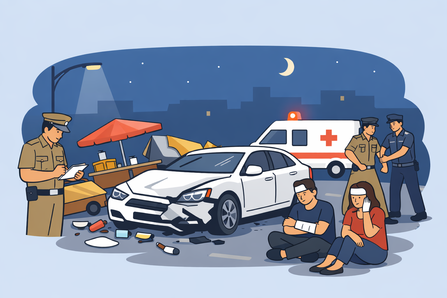 According to the police, the car first struck a road divider and then went out of control, crashing into roadside shops and food carts over a stretch of nearly 30 metres. Several parked vehicles were also damaged, creating chaos and panic in the area.